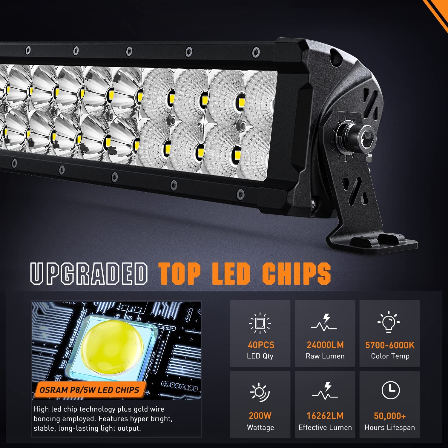 Trusted Hyper Bright: Employ top-notch Osram P8/5W led chips, total 200 watts, with lighting performance 24000LM/PC, 3950Lux@10Meters, 1Lux@628Meters (2060FT). Features a trusted ultra-bright, high-intensity, stable light output. Improves driving safety with a clearer, wider, and further visual area. And lifespan extends over 50,000 hours.