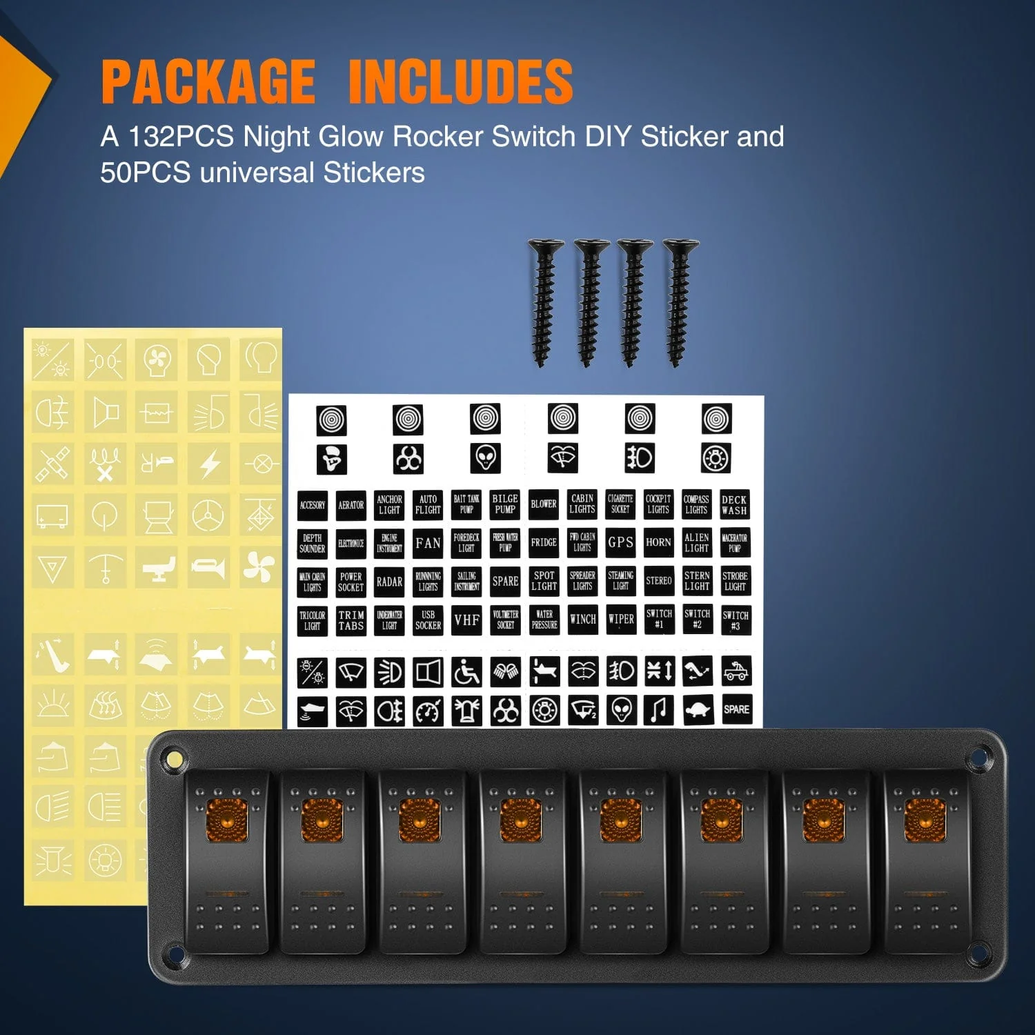 - Package Includes: A pre-wired rocker switch panel, 4 Screws, 1 set of DIY stickers, a wiring diagram.